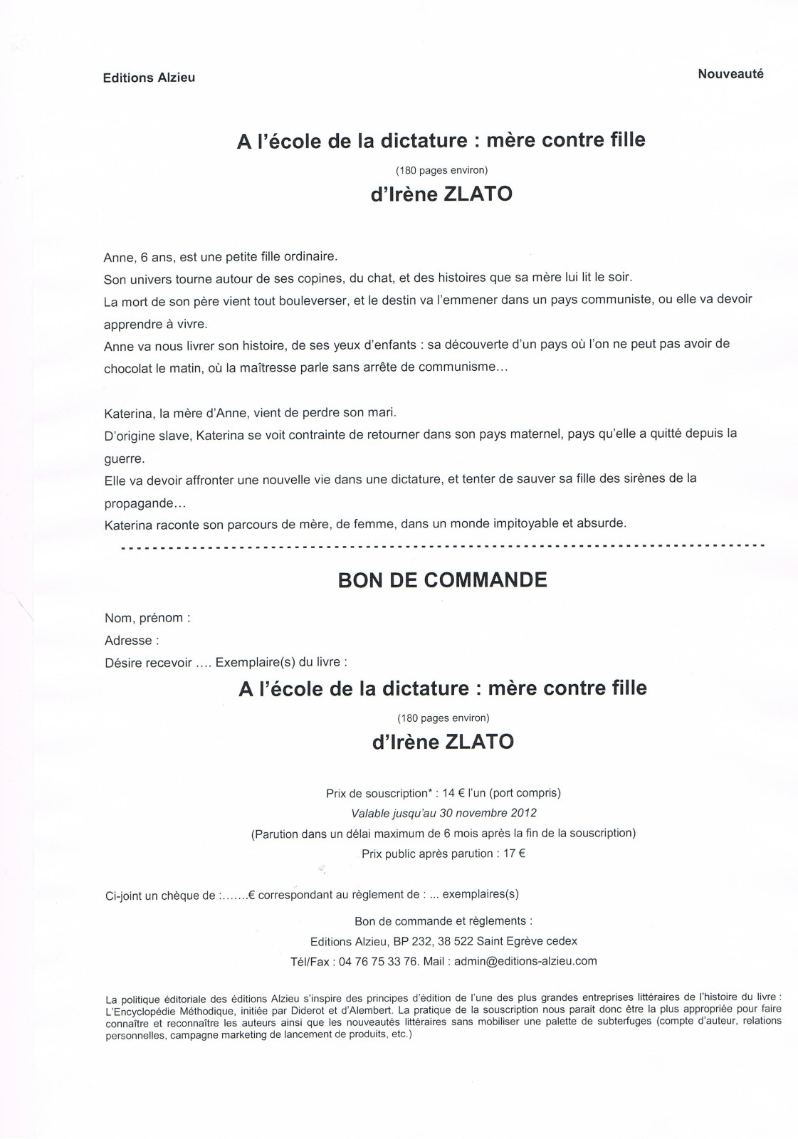 Si le livre vous tente, vous pouvez le commander en renvoyant le bon de commande ci-dessous.
